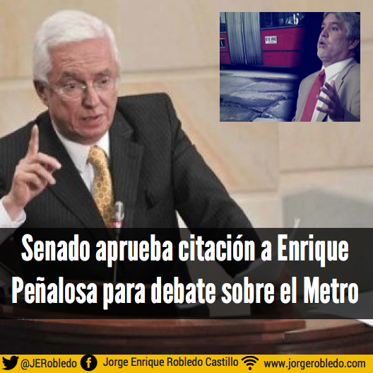 El pasado martes 29 de marzo la Comisión V del Senado de la República aprobó por solicitud del senador Jorge Enrique Robledo, la realización de un debate de control político sobre el Metro de Bogotá al cual será citado el alcalde mayor de Bogotá Enrique Peñalosa.