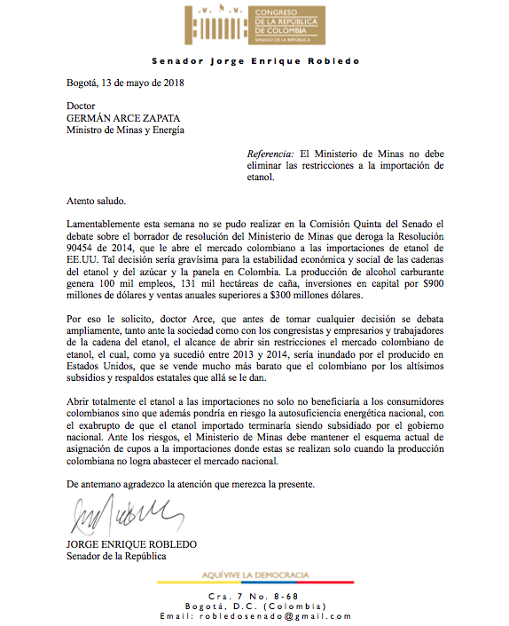 En carta dirigida al Ministro de Minas y energía Germán Arce el senador Jorge Enrique Robledo advierte sobre las implicaciones para la estabilidad económica y social del etanol, el azúcar y la panela en Colombia, la medida de abrir sin restricciones el mercado colombiano a las importaciones de etanol de Estados Unidos.