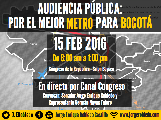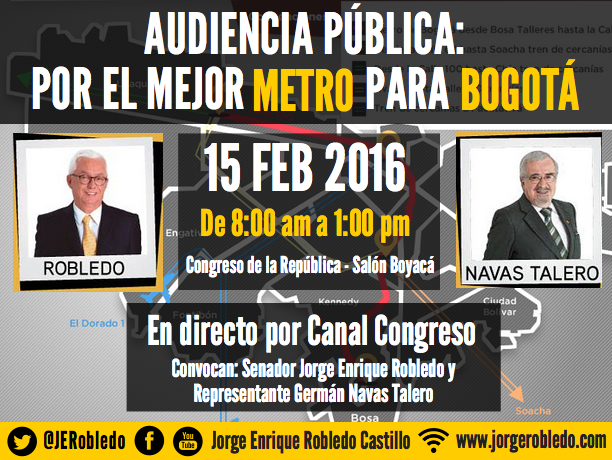 Con la participación de especialistas de muy alto nivel técnico, el senador Jorge Enrique Robledo y el representate Germán Navas Talero realizarán el próximo 15 de febrero de 2016, entre las 8:00 AM y la 1:00PM con transmisión en directo por el Canal del Congreso, la Audiencia Pública: Por el mejor Metro para Bogotá.