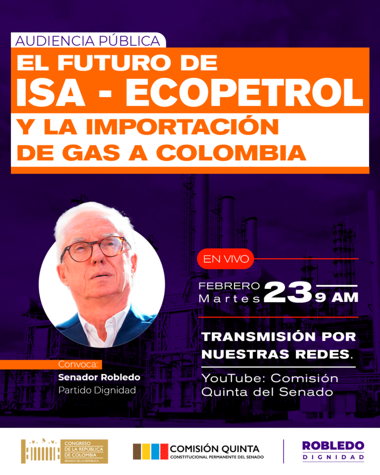 Sala de Prensa, 19 de febrero de 2021. El próximo martes 23 de febrero, a partir de las 9:00 a.m., se llevará a cabo en la Comisión Quinta del Senado de la Repú- blica, la audiencia pública El Futuro de ISA-Ecopetrol y la importación de Gas en Colombia, convocada por el senador de DIGNIDAD, Jorge Enrique Robledo y el presidente de la Comisión, senador Guillermo García Realpe.