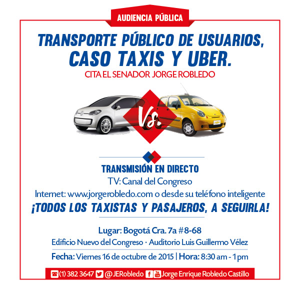 El próximo viernes 16 de octubre se realizará en el Congreso de la República la audiencia pública Transporte público de pasajeros, caso taxis y Uber. La audiencia citada por el senador Jorge Enrique Robledo, se realizará en el auditorio Luis Guillermo Vélez (Edificio Nuevo del Congreso, Cra 7a #8-68 Bogotá), entre las 8:30 am y la 1 pm y tendrá transmisión en directo por el Canal del Congreso y también podrá seguirse por www.jorgerobledo.com