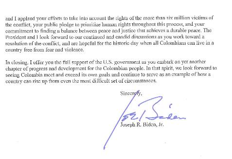 Carta completa del vicepresidente de Estados Unidos Joe Biden a Juan Manuel Santos: