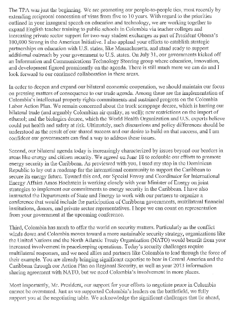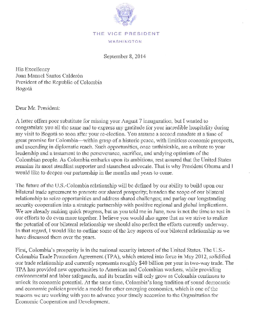 Carta del vicepresidente de EE. UU., Joe Biden al presidente Santos – Gobierno – ELTIEMPO.COM http://bit.ly/1wBi8lD