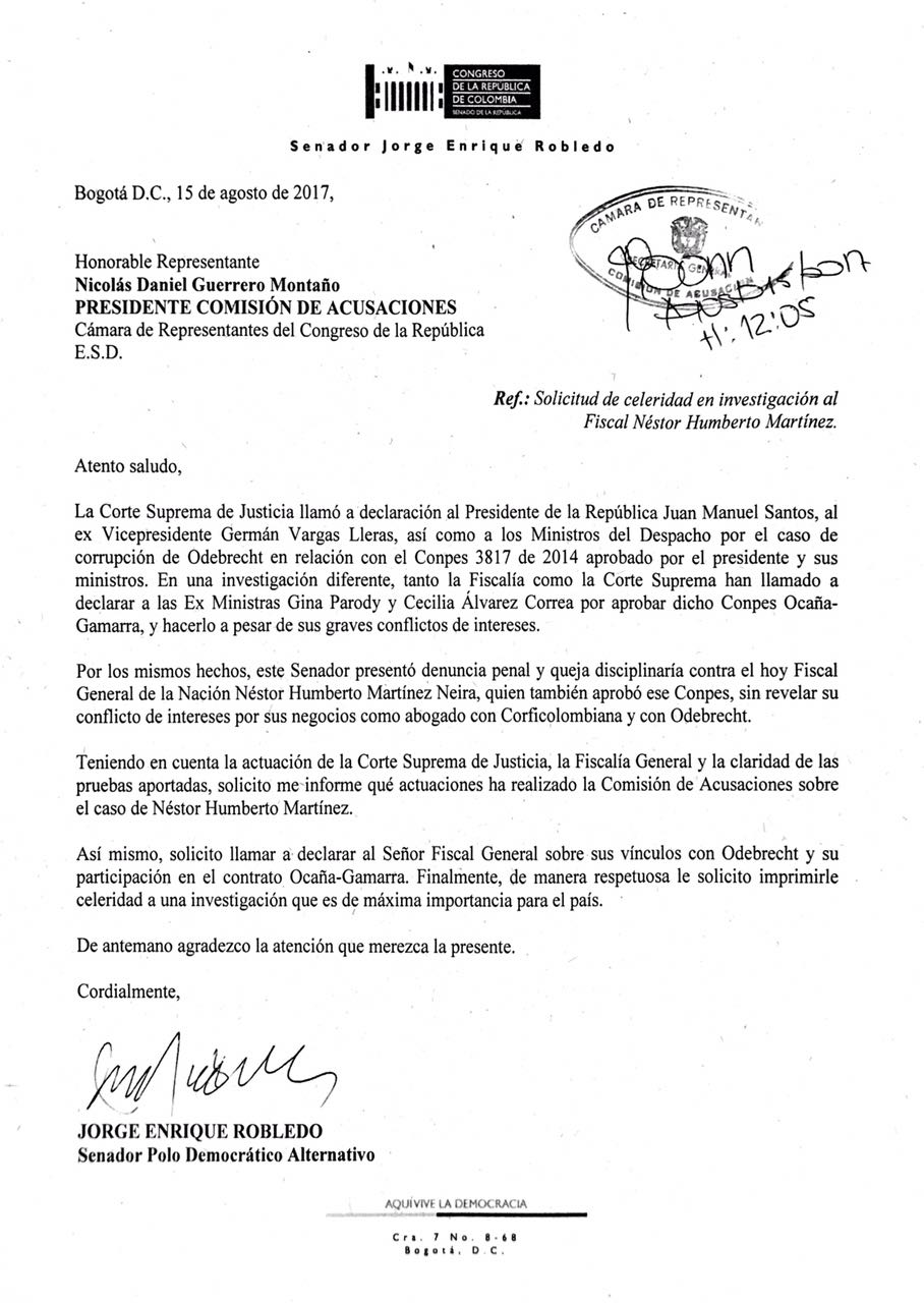 El senador Robledo solicitó a la Comisión de Acusaciones que cite al Fiscal Martínez Neira a declarar por su participación en la aprobación del CONPES 3817 que permitió entregarle a dedo la vía Ocaña-Gamarra a Odebrecht.