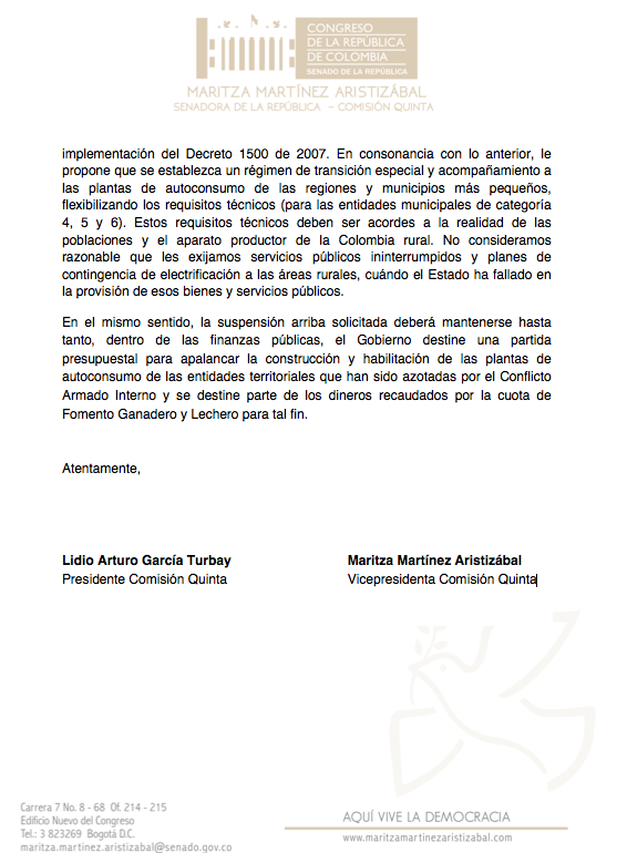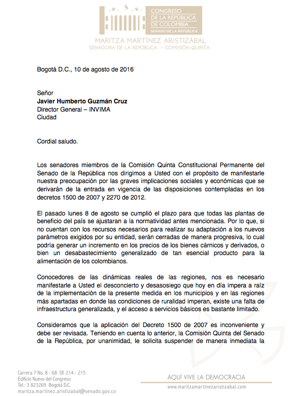 La comunicación firmada por el senador Lidio Garcia y la senadora Maritza Martínez, Presidente y Vicepresidenta de la Comisión Quinta del Senado respectivamente, manifiesta que “El pasado lunes 8 de agosto se cumplió el plazo para que todas las plantas de beneficio del país se ajustaran a la normatividad antes mencionada. Por lo que, si no cuentan con los recursos necesarios para realizar su adaptación a los nuevos parámetros exigidos por su entidad, serán cerradas de manera progresiva, lo cual podría generar un incremento en los precios de los bienes cárnicos y derivados, o bien un desabastecimiento generalizado de tan esencial producto para la alimentación de los colombianos.”