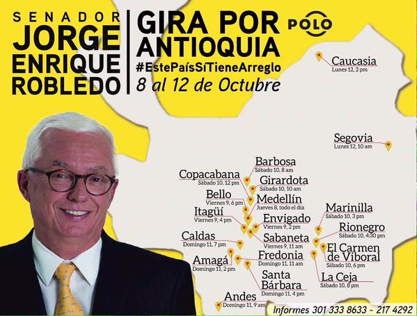 El primer día de la gira por Antioquia, el jueves 8 de octubre, Robledo visitó seis comunas de Medellín y llamó a votar por Luz María Múnera y por los demás miembros de la lista del Polo al concejo de la capital antioqueña. El viernes 9, Robledo visitó Sabaneta, Envigado, Itagüí y Bello, importantes municipios del Valle de Aburrá.