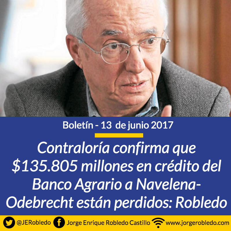 “La Contraloría General acaba de darle la razón a este senador y a José Roberto Acosta, vocero de Justicia Tributaria, quienes desde enero advertimos que la plata del irregular crédito del Banco Agrario a Navelena-Odebrecht se había embolatada,” expresó el senador Jorge Enrique Robledo. La Contraloría estableció que a la fecha hay un detrimento patrimonial en contra del Estado por 135.805 millones de pesos.