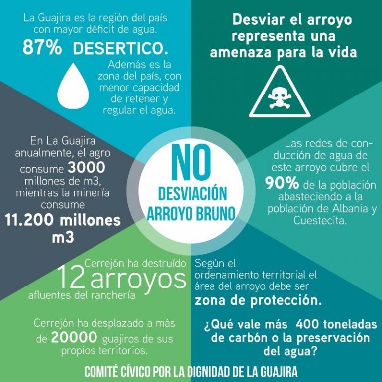 Desviar el Arroyo Bruno, uno de los seis principales afluentes del Río Ranchería (La Guajira), es otro repudiable atentado contra vida de los guajiros, explicó el senador Jorge Enrique Robledo. La modificación del cauce del Bruno autorizada por la Anla, se sumaría a la de los otros 27 arroyos ya desviados por la multinacional minera El Cerrejón, de los cuales doce han sido destruídos, y se aplica en el departamento con el mayor déficit de agua del país.