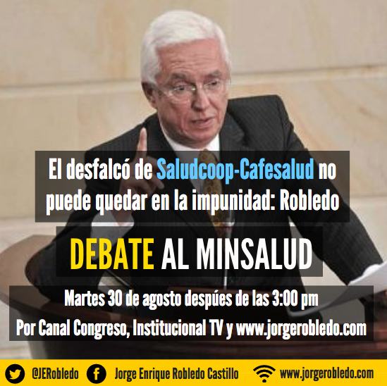 La semana pasada, el congresista del Polo denunció que los $1.4 billones que la SaludCoop le tumbó a la salud están a punto de perderse porque los funcionarios nombrados por el ministro Alejandro Gaviria los integraron como una deuda patrimonial de la EPS, decisión inconstitucional, como lo ha explicado la jurisprudencia del Consejo de Estado y de la Corte Constitucional (bit.ly/2c3QgEE). Para analizar estos graves hechos y explicar cómo la liquidación de Saludcoop ha sido un desastre, Robledo citó a debate al Ministro de Salud, el cual se realizará el próximo martes 30 de agosto a las tres de la tarde en la plenaria del Senado con transmisión en directo por el Canal del Congreso y Señal Institucional.