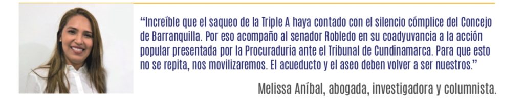 JER: Sancionar legal y políticamente a los que robaron y dejaron robar. Pero además el alcalde Alejandro Char debe caducarles a los españoles la concesión de la Triple A, para poner el acueducto y el aseo en manos de todos los barranquilleros, mejorando los servicios, reduciendo las tarifas y reinvirtiendo las utilidades en el progreso de Barranquilla y de las demás poblaciones cubiertas por la Triple A. Y parecido puede hacerse con Electricaribe.