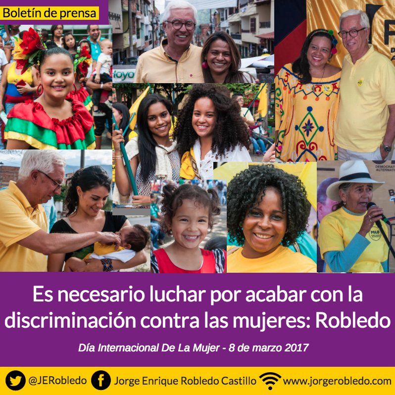 En el día internacional de las mujeres, el Senador Jorge Enrique Robledo extendió un afectuoso saludo a todas las colombianas resaltando que su lucha contra la discriminación de todo tipo está vigente. Para Robledo “mientras gobiernen los mismos con las mismas difícilmente venceremos la cruel desigualdad que invade a nuestro país y que es peor en el caso de las mujeres”.