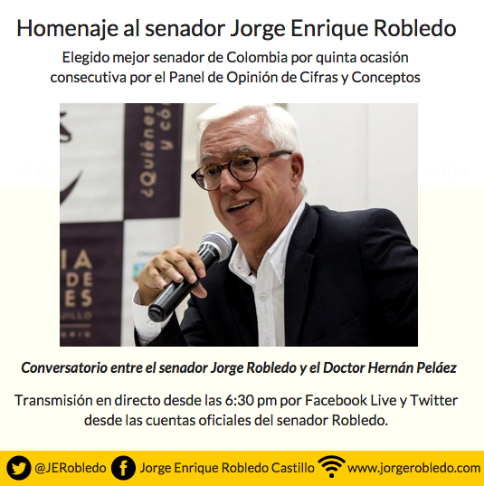 El evento, que tendrá una charla informal entre el Doctor Hernán Peláez y el senador Jorge Enrique Robledo en torno a su vida estos 14 años en el Congreso, lecciones, experiencias y anécdotas, se transmitirá en directo por Facebook Live y Twitter desde las cuentas oficiales del senador Robledo.