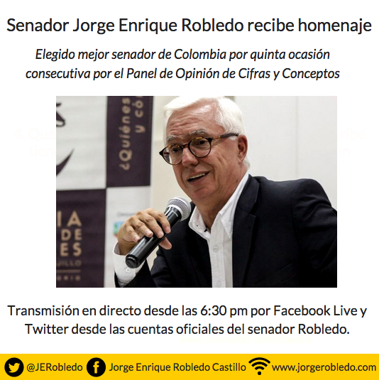 Amigos y seguidores asistirán hoy al Club de Ejecutivos a un homenaje al senador Jorge Enrique Robledo quien recientemente fue elegido, por quinta ocasión consecutiva, como el mejor senador del país por el Panel de Opinión de la firma Cifras y Conceptos.