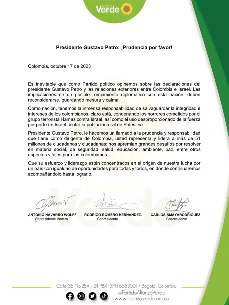 Incluso el partido político Alianza Verde publicó un comunicado exigiéndole prudencia al mandatario colombiano: