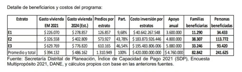 Según Robledo, en Bogotá hay cerca de 83 mil familias vulnerables que viven en arriendo y serán beneficiadas con la entrega de subsidios de entre $300.000 y $490.000 a partir de su primer día de gobierno en el 2024. Este proyecto tendrá una duración de dos años en los que invertirá $900.000 millones, es decir que se hará una inversión anual de $450.000 millones.