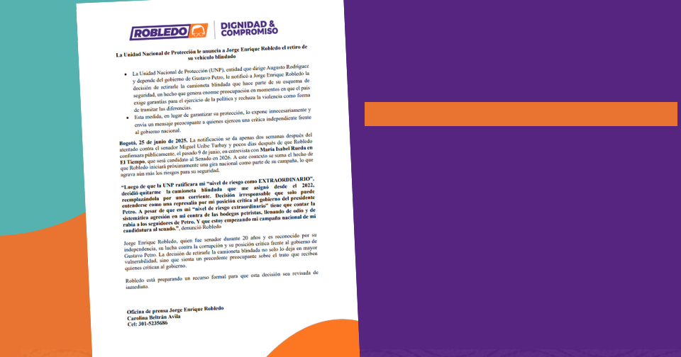 - La Unidad Nacional de Protección (UNP), entidad que dirige Augusto Rodríguez y depende del gobierno de Gustavo Petro, le notificó a Jorge Enrique Robledo la decisión de retirarle la camioneta blindada que hace parte de su esquema de seguridad, un hecho que genera enorme preocupación en momentos en que el país exige garantías para el ejercicio de la política y rechaza la violencia como forma de tramitar las diferencias.