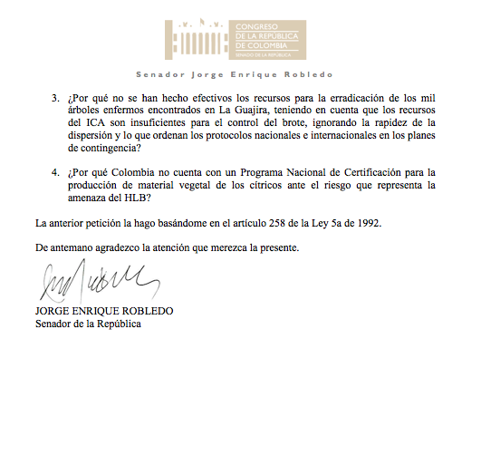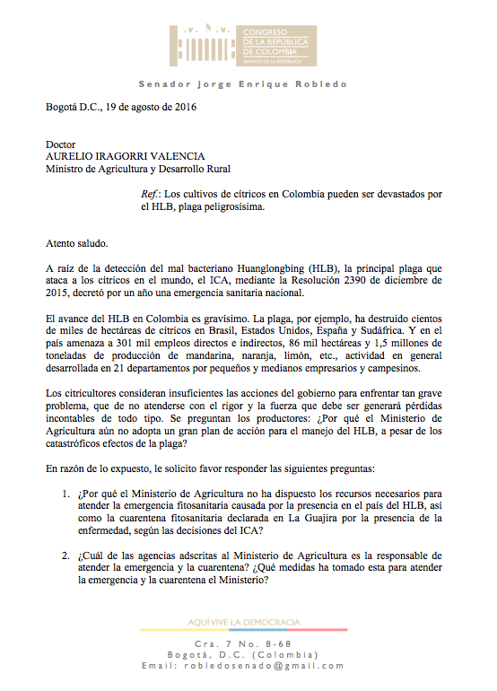 En carta enviada hoy por el senador Jorge Enrique Robledo al ministro de Agricultura, doctor Aurelio Iragorri, donde le pregunta por lo planes para contener el avance del mal bacteriano HLB, “la principal plaga que ataca a los cítricos en el mundo.”