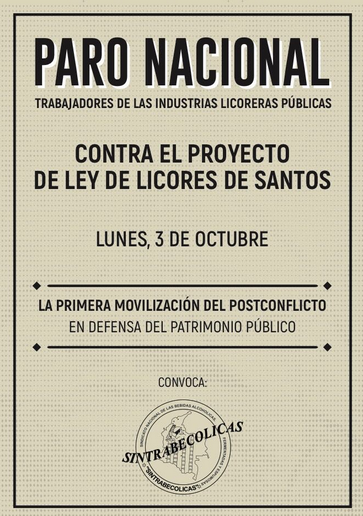 Desde hoy a las 6 am, los trabajadores de las industrias licoreras colombianas, liderados por el Sindicato Nacional de Bebidas Alcohólicas (Sintrabecolicas), se declararon en paro por el trámite de la inconstitucional ley de licores, de autoría del ministro Mauricio Cárdenas y de la Ministra de Comercio. Los trabajadores rechazan el desmonte del monopolio constitucional que existe sobre la producción, introducción y distribución de licores en Colombia. La medida empujará a la quiebra a la industria nacional desplazando el trabajo nacional hacia el extranjero.