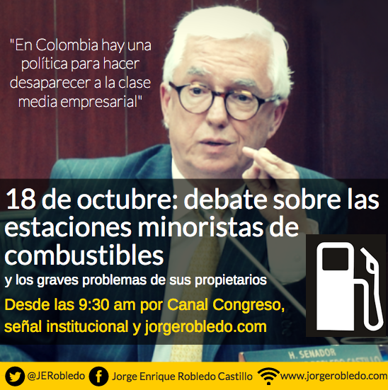 Mañana martes 18 de octubre en la Comisión Quinta del Senado, desde las 9:30 am y con transmisión en directo por Señal Institucional, Canal del Congreso y www.jorgerobledo.com, el senador Jorge Enrique Robledo realizará un debate de control político sobre la difícil situación por la que están pasando los pequeños y medianos propietarios de las estaciones minoristas de combustibles. Los distribuidores mayoristas, casi todos multinacionales, se están integrando verticalmente, concentrando la pequeña y mediana propiedad colombiana hacia poderosas compañías extranjeras. Al debate está citado el Ministro de Minas y Energía Germán Arce.