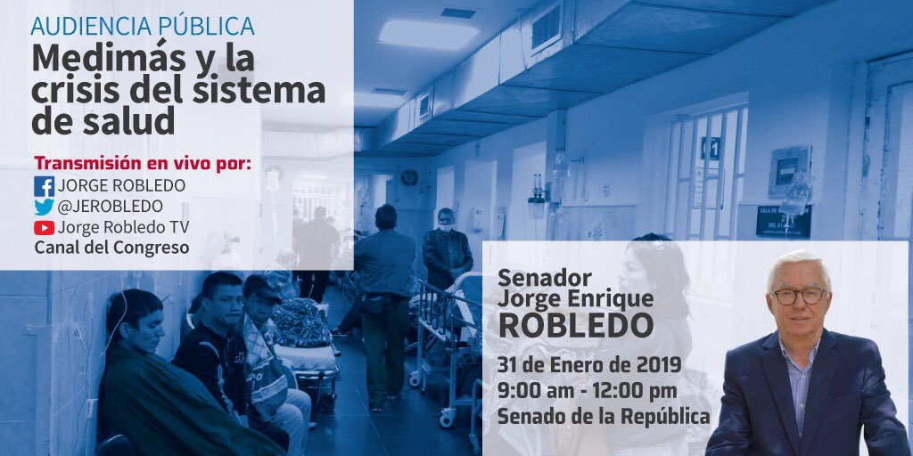 El próximo jueves 31 de enero, entre las 9am y las 12.30 pm, se realizará la audiencia pública Medimás y la crisis del sistema de salud, evento que ha sido citado por el senador Jorge Enrique Robledo. La audiencia realizará en el recinto de la Comisión Quinta del Senado y se transmitirá en vivo por el Canal del Congreso y por las redes sociales del senador Robledo.