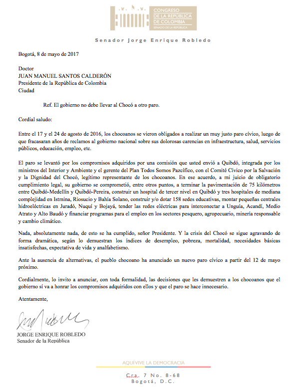 En una carta dirigida al Presidente de la República Juan Manuel Santos, el senador Jorge Enrique Robledo le recuerda al gobierno nacional los compromisos adquiridos con los chocoanos tras el paro cívico llevado a cabo entre el 17 y el 24 de agosto de 2016 y advierte que: “ante la ausencia de alternativas, el pueblo chocoano ha anunciado un nuevo paro cívico a partir del 12 de mayo próximo”.