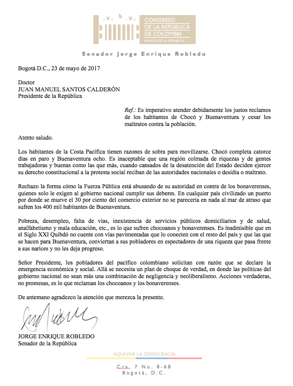 Robledo a Santos “es imperativo atender debidamente los justos reclamos de los habitantes de Chocó y Buenaventura y cesar los maltratos contra la población”