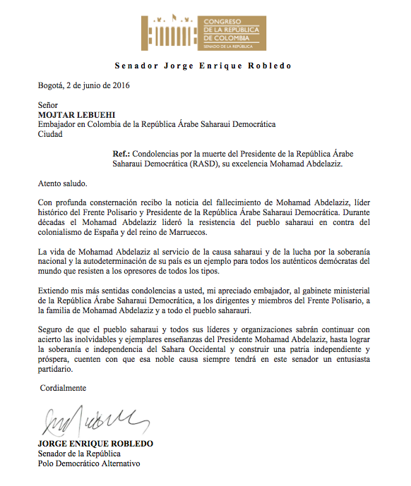 El senador Jorge Enrique Robledo del Polo Democrático expresó, mediante una carta enviada al Dr. Mojtar Lebuehi, Embajador en Colombia de la República Arabe Saharai Democrática, sus condolencias al pueblo saharaui ante el fallecimiento del líder histórico del Frente Polisario y Presidente de la R.A.S.D Mohamead Abdelaziz.
