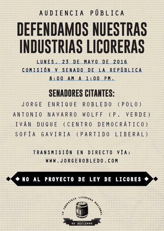El próximo lunes 23 de mayo, en el recinto de la Comisión Quinta del Senado de la República, los senadores Antonio Navarro W., Sofia Gaviria, Iván Duque y Jorge Enrique Robledo, citaron a la audiencia pública Defendamos nuestras licoreras. El evento contará con transmisión en directo por el Canal Congreso y se realizará entre las 8:00 AM y las 1:00 PM.