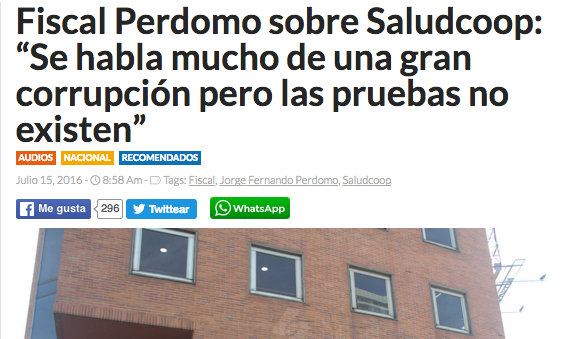 Fiscal Perdomo: Mire, en el tema Saludcoop nosotros desde el principio creamos un grupo investigativo. Ese grupo investigativo no solo está acometiendo los temas de Saludcoop, sino muchos otros temas de salud, porque aquí, pues, hay que analizar muchas cosas del sistema, para ver si el sistema como funciona es corrupto, si se lo han robado. Esa es, digamos, una primera precisión que quiero hacerle. Nosotros estamos investigando aquí muchas cosas del sistema de salud.