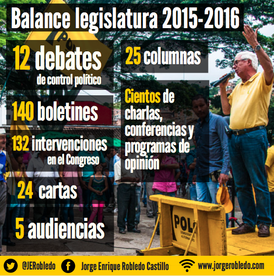 Balance del trabajo del senador Robledo en la legislatura 2015 – 2016. 12 debates de control político, 5 audiencias públicas, gira nacional por 136 municipios y 25 departamentos, 24 cartas, 25 columnas de opinión, 137 boletines de prensa. Participación en programas de opinión y foros académicos. Acompañamiento a las luchas sociales y oposición al gobierno de Santos, la nota predominante en su trabajo legislativo.